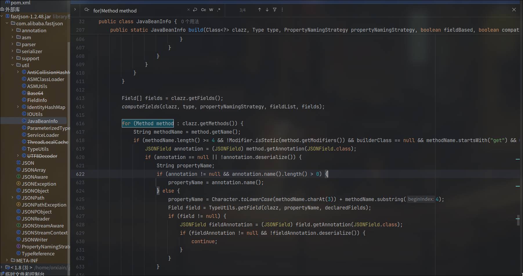 持续跟进,到JavaBeanInfo这里的616行(1.2.48版本),从getBuilderClass方法反射获取到@type值的类,并遍历其所有方法,若符合一些特性则反射调用