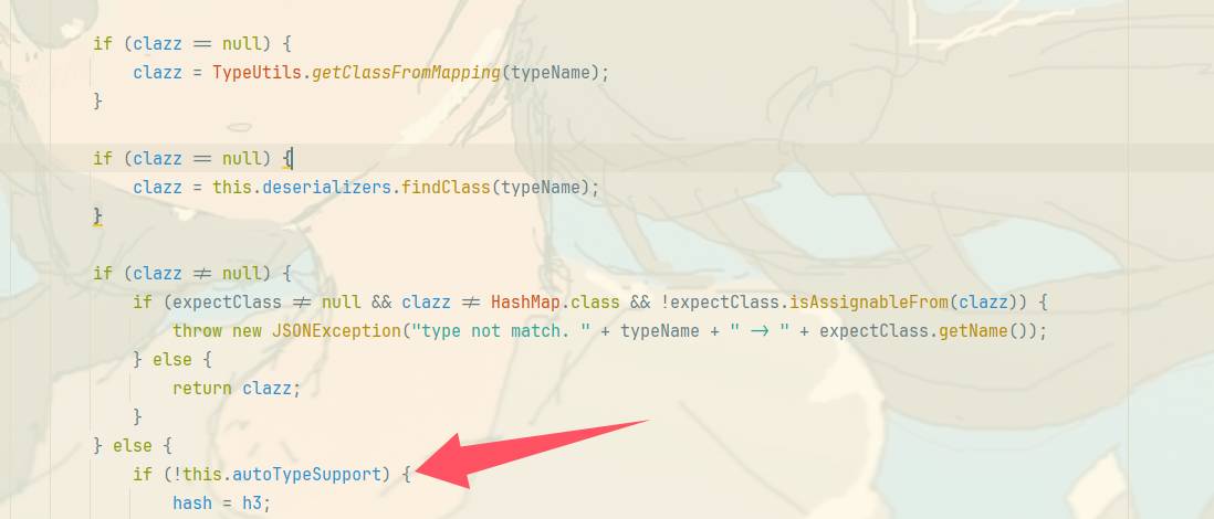 来看这个方法,我们发现它的会先从typeutils的mapping和deserializers中查询,然后return回一个clazz,这些步骤在检测autoTypeSupport之前