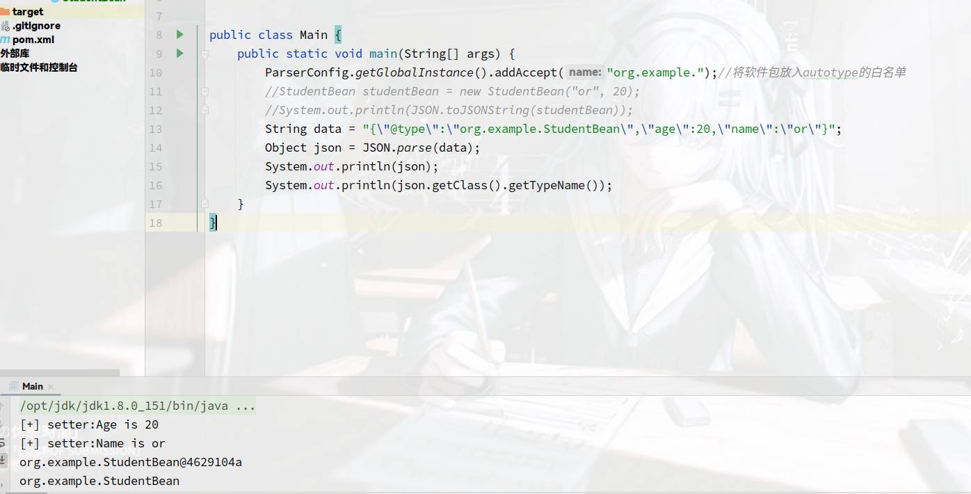 首先,对json数据直接进行parse的操作返回的是JSONObject对象,而想要指定反序列化之后返回的对象类型,需要在json数据中指定@type 属性,parse会根据这个属性,通过java的反射机制和内省机制获取bean类的基本信息,获取要反序列化的目标对象类并反射调用相关setter