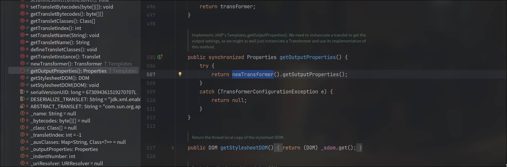 不难发现TemplatesImpl的getOotputProperties方法调用了newTransformer(),一路调用到getTransletInstance()