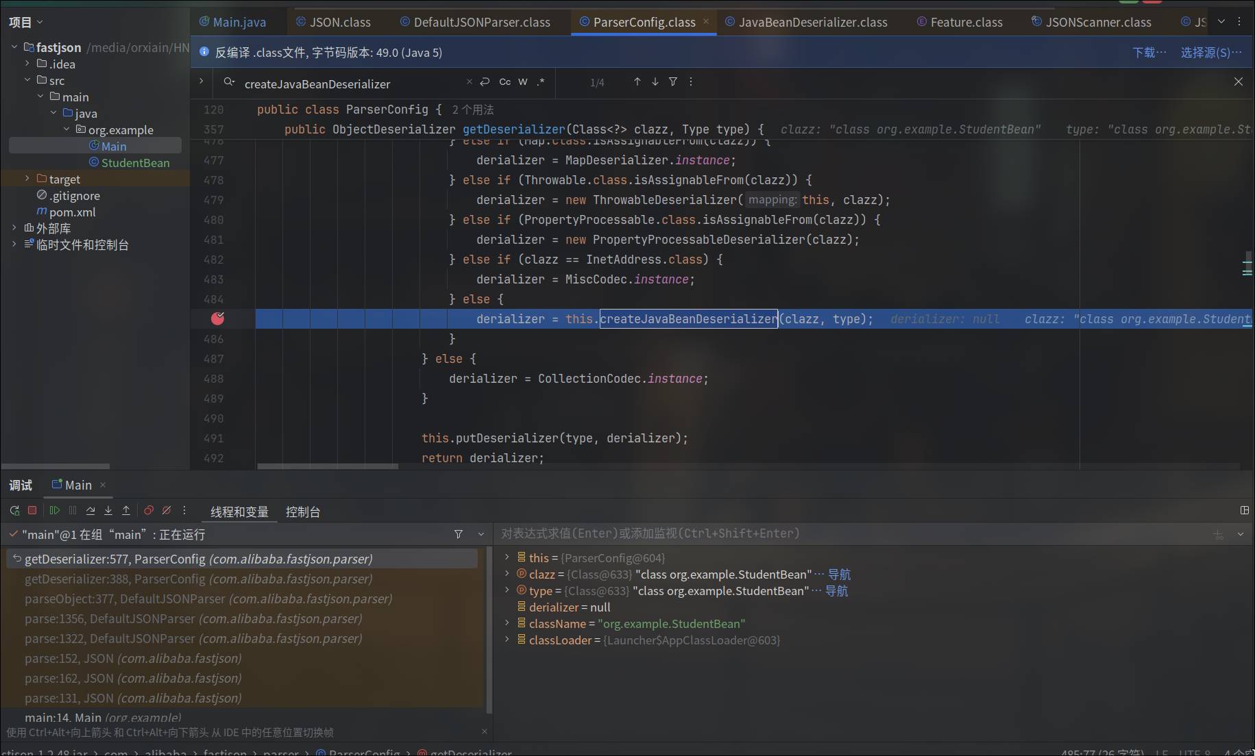 调用之后返回JavaBeaninfo,继续创建了JavaBeanDeserializer,加载类到内存,之后调用了deserialze方法