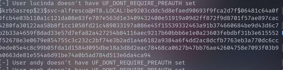 svc-alfresco这个用户跑出来了, 以下是hash