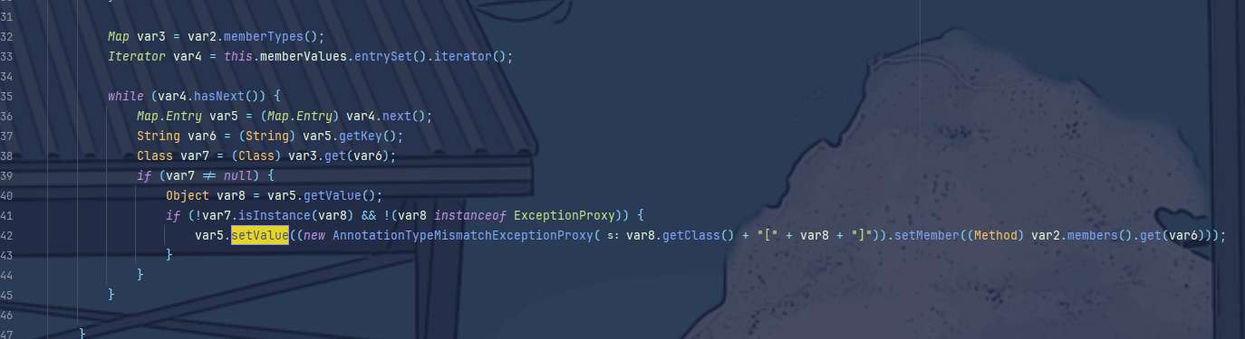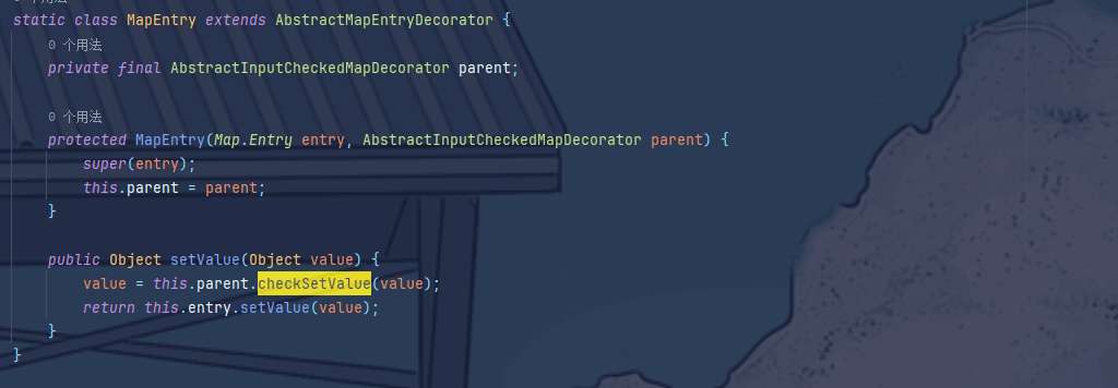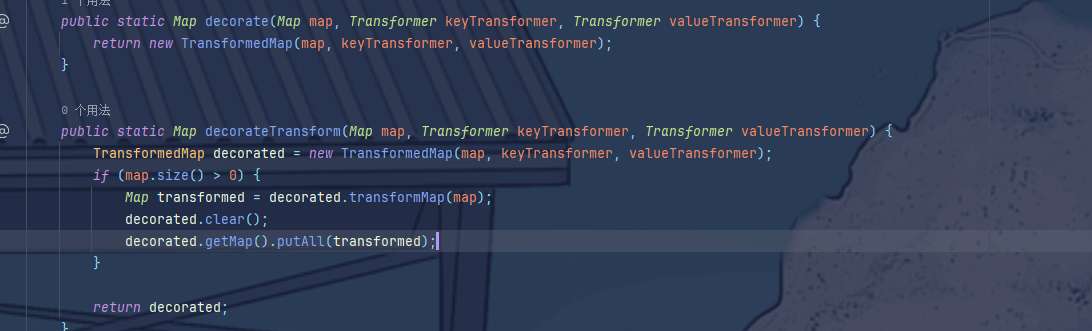 TransformedMap中的transformKey、transformValue和checkSetValue调用了transformer,但这些方法都属于protected,所以继续找会调用这些方法但属于public的另一些方法,于是有这么两个符合条件