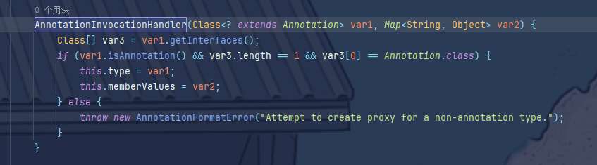 AnnotationInvocationHandler的构造方法,需要两个参数,一个是继承Annotation的类,另一个是Map