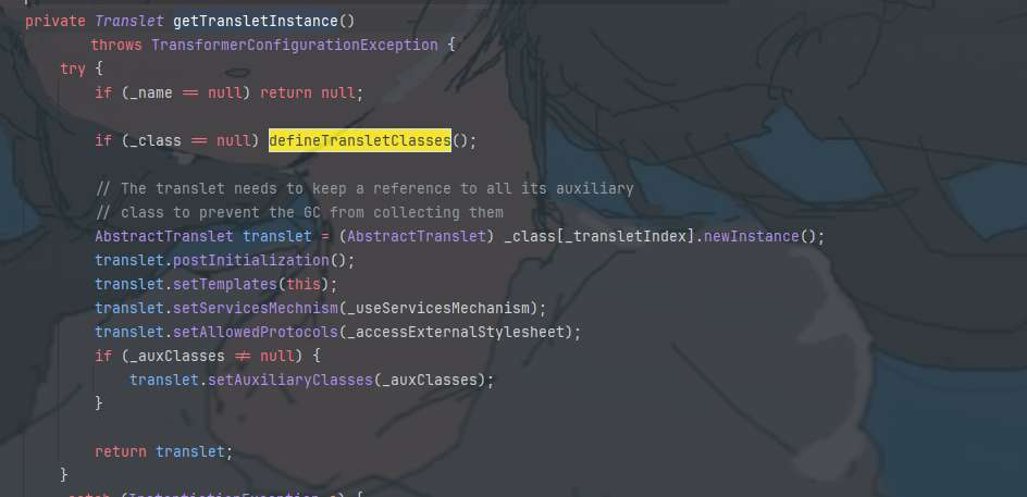 Method defineTransletClasses = TemplatesImpl.class.getDeclaredMethod("getTransletInstance");