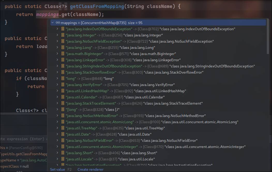 第一个type需要是一个抽象类或者接口,且在第一次进行CheckAutoType时需要能返回一个类,我们也可以很方便的到记录了已缓存类的mapping中找一个
