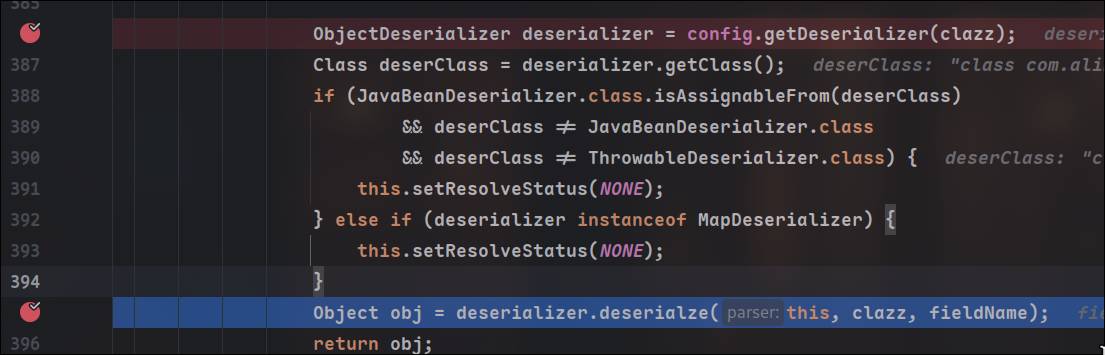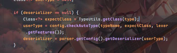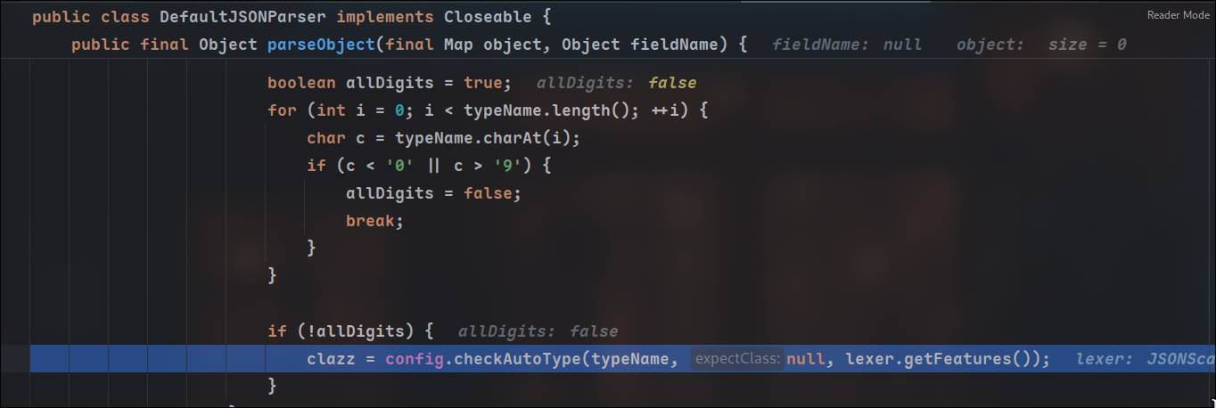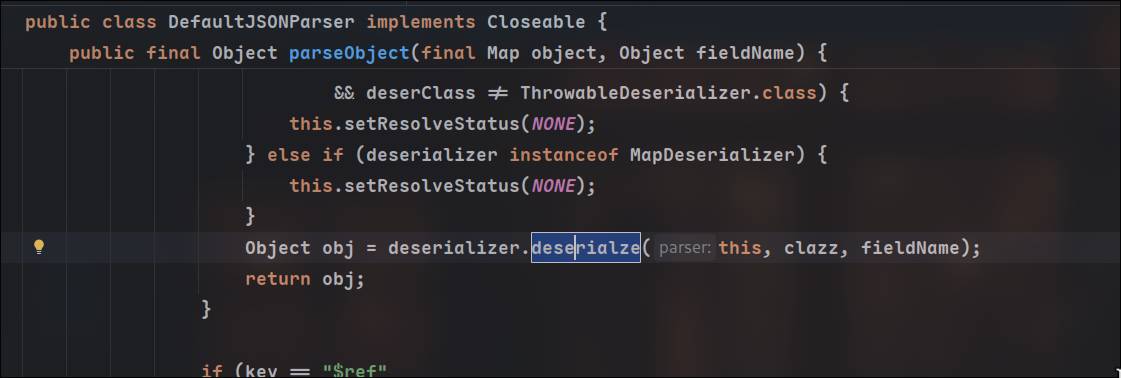 在DefaultJSONParser的调用反序列化加载器的地方,传入这个type,这里的type就是当前解析json数据里的@type属性,注意不要将type和typename搞混,typename是恶意类名