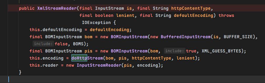 通过XmlStreamReader的构造函数XmlStreamReader(final InputStream is, final String httpContentType,final boolean lenient, final String defaultEncoding)接受一个Inputstream对象,其中调用了doHttpStream方法⬇️