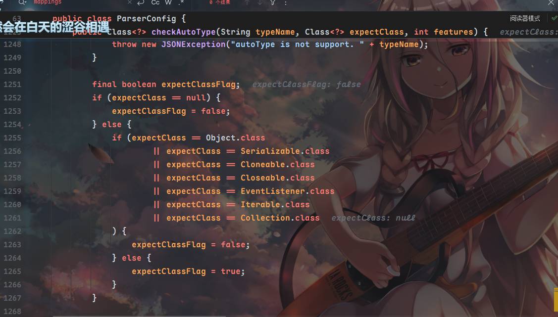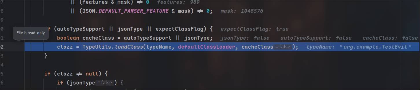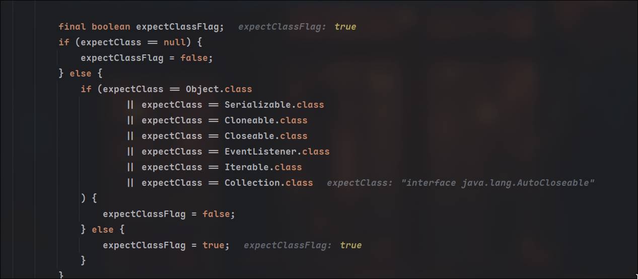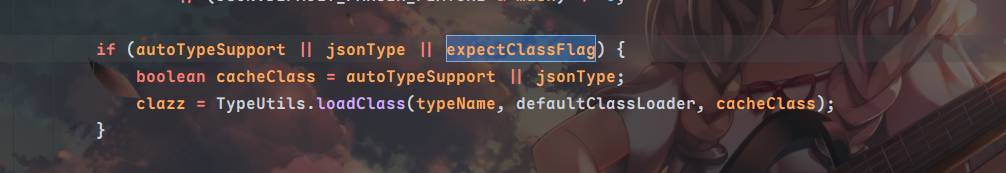 当expectclassflag为true且autotypesupport为flase时,可以运行到⬇️(ParseConfig 1400行)进行类加载,为了让expectclassflag为true,需要让expectclass不为判断中的类,最终加载类与期望类无关,传入一个不会被匹配到的类即可,当然也不止这一个条件