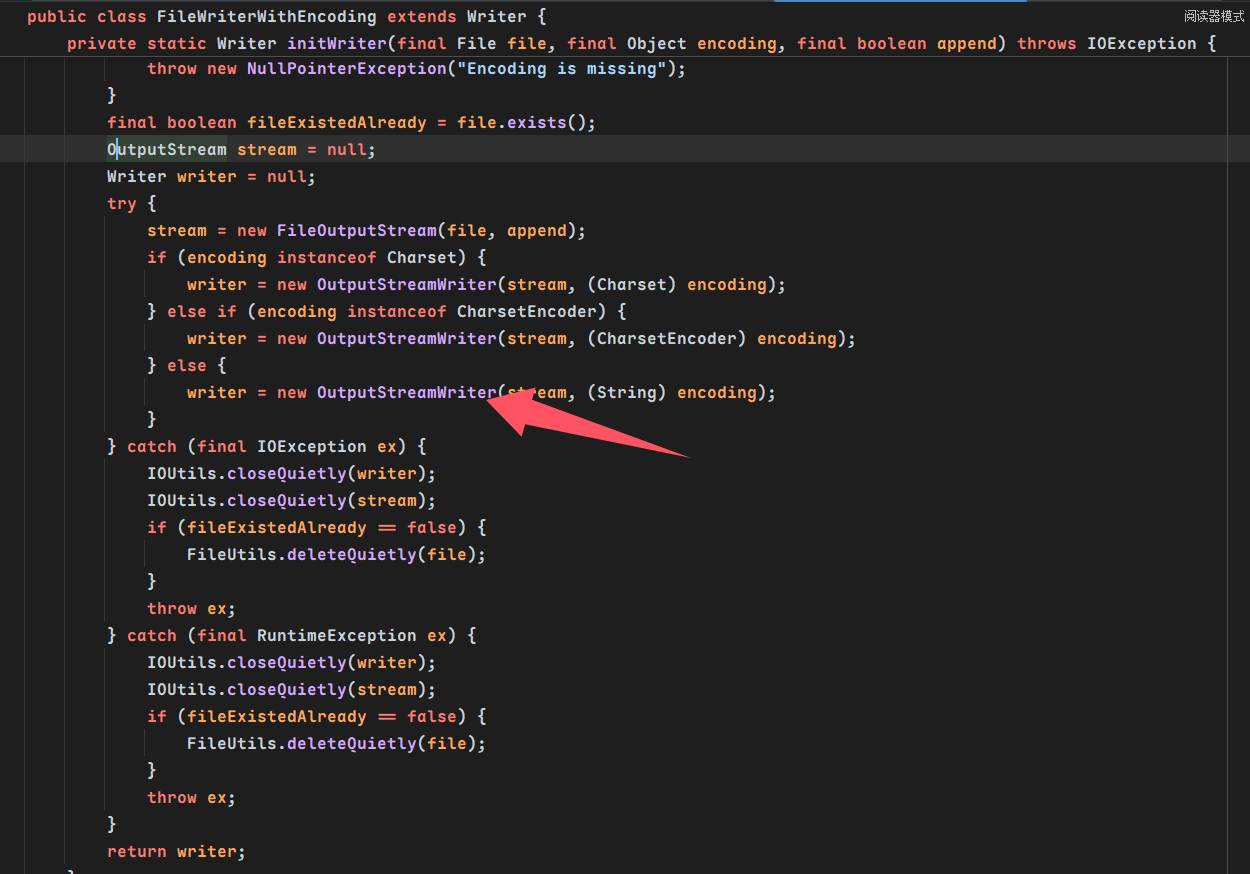 传哪个?并且我们需要有个fileoutputstream对象,关注到FileWriterWithEncoding,它的write方法又调用了这个类的类属性中的writer,这个writer是从initWriter方法中被赋值的,可以看到新建了一个FileOutputStream对象传入OutputStreamWriter⬇️