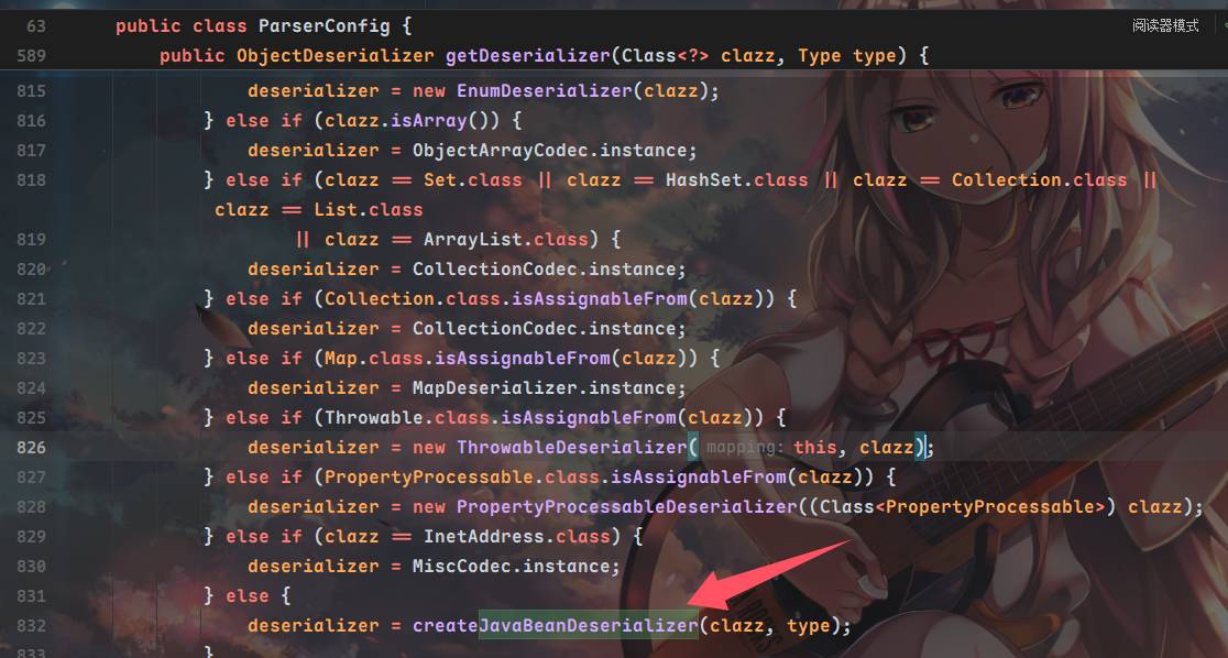 而为了调用JavaBeanDeserializer类的deserializer,首先需要获取JavaBeanDeserializer这个反序列化加载器,也就是说在getDerserializer方法这里不能匹配到任何其他类提前加载