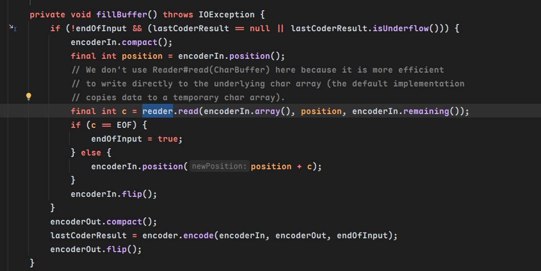 fillBuffer用来将读取reader的字符并将其放入内部的字符缓冲区(encoderIn)