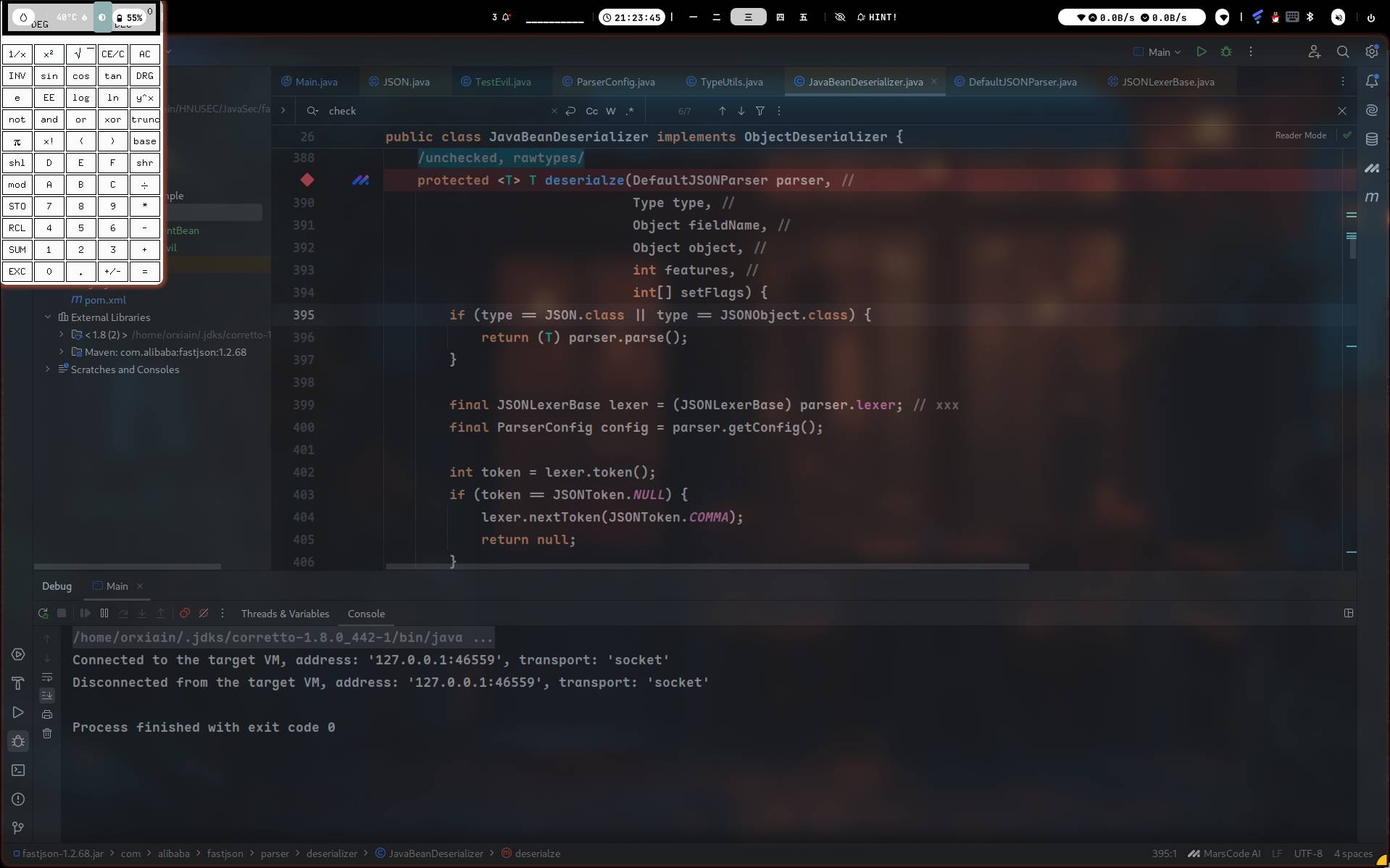 接下来在这里,判断了type属性的类是否在白名单里,并且检查是否开启了AutoTypeSupport和是否是期望类,然后计算类的hash值,与白名单类hash表内查询,查到则直接加载返回clazz,如果在deny的表里就直接报错不进行反序列化处理,也不在这个表里则继续进行跳出循环⬇️