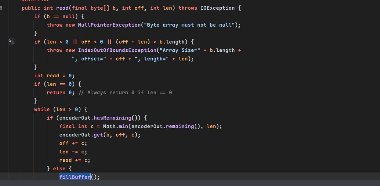 我们关注到ReaderInputStream方法的read(final byte[] b, int off, int len)方法