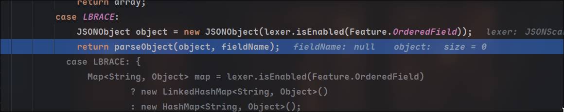 进到DefaultJSONParser调用DefaultJSONParser的parse方法解析字符串,在里面调用parseObject进行对象的解析